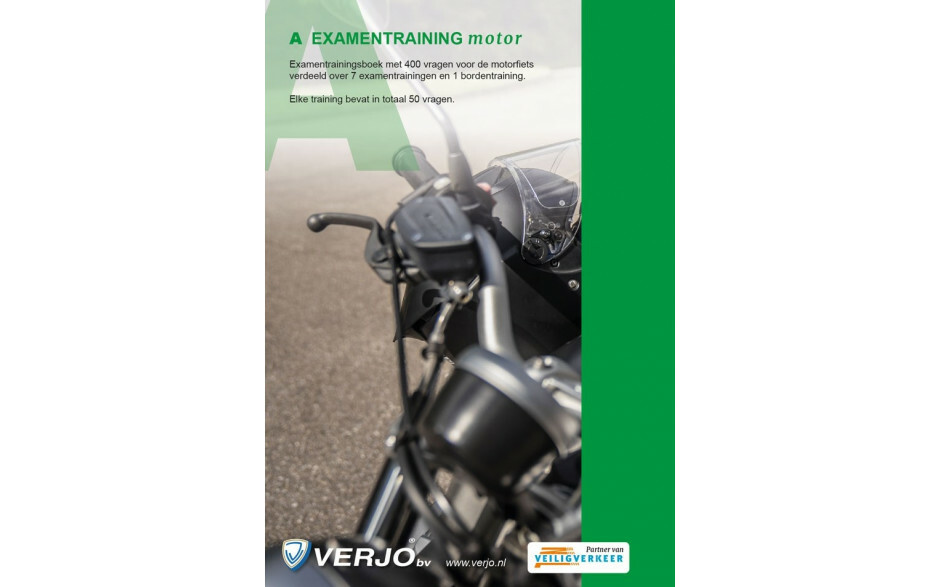 Examentrainingsboek met 400 vragen voor de motor verdeeld over 7 examentrainingen en 1 bordentraining. Elke training bevat in totaal 50 vragen.